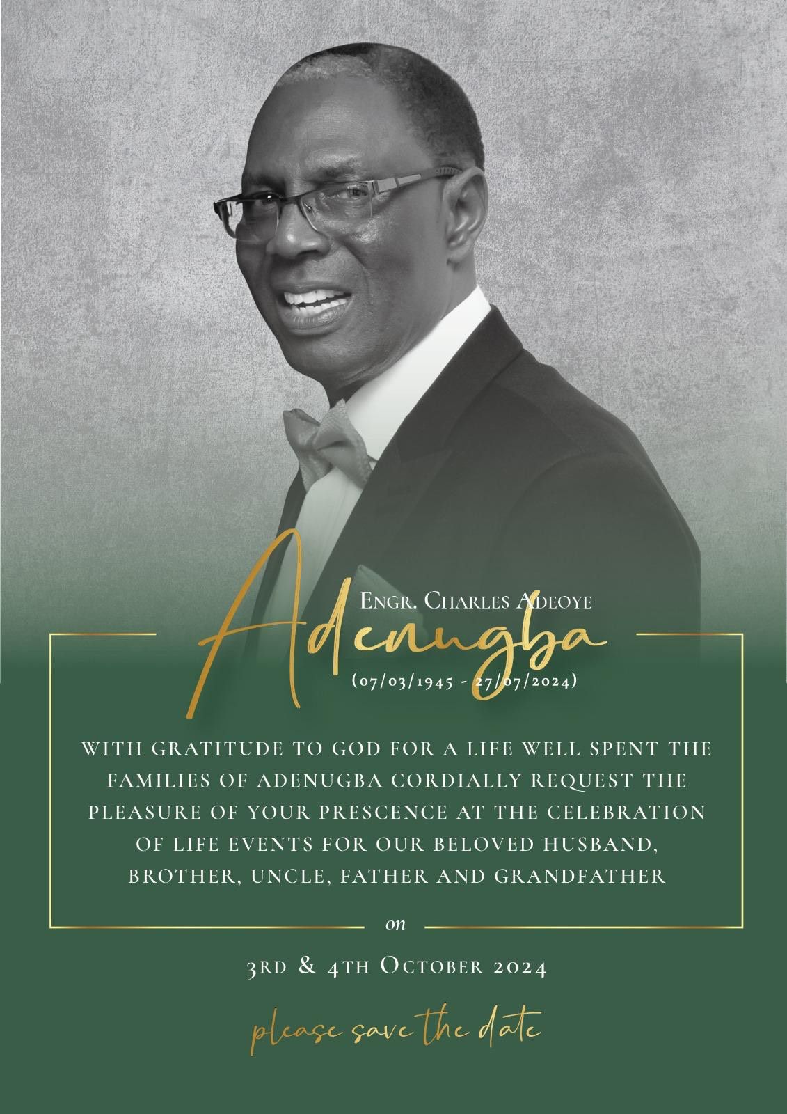 Cordially request the pleasure of your presence at the Burial, Funeral & Celebration of Life Memories of our beloved Husband, Brother, Uncle, Father, and Grandfather Engr. Charles Adeoye Adenugba